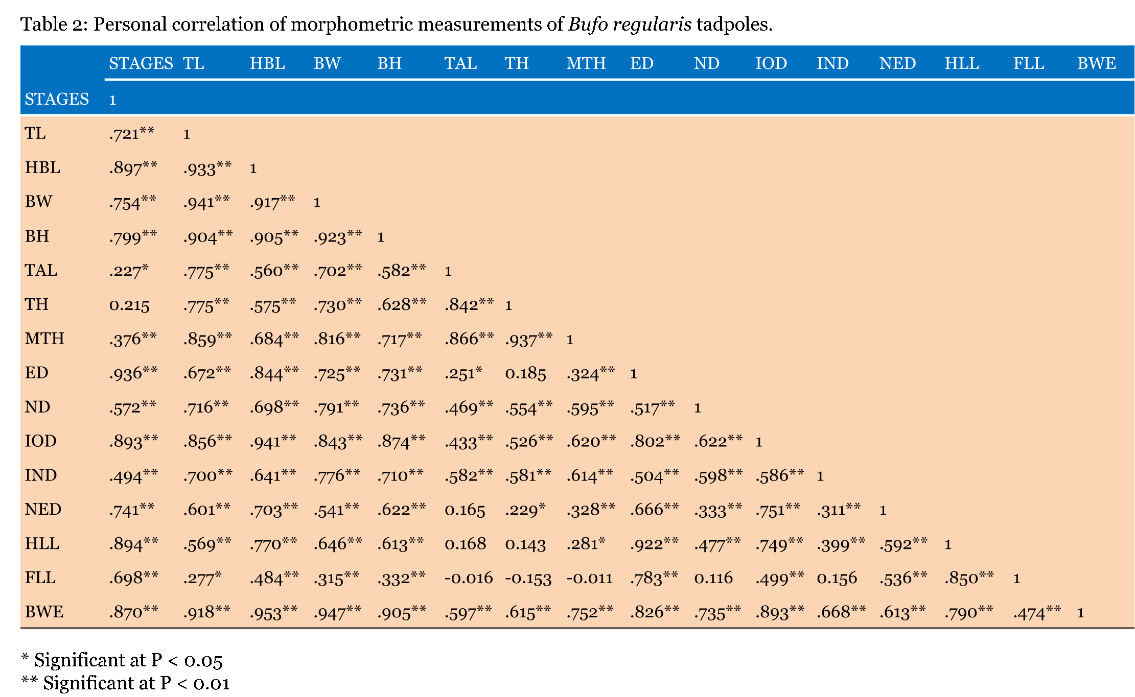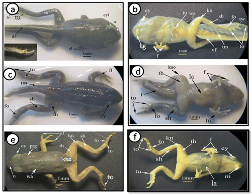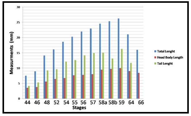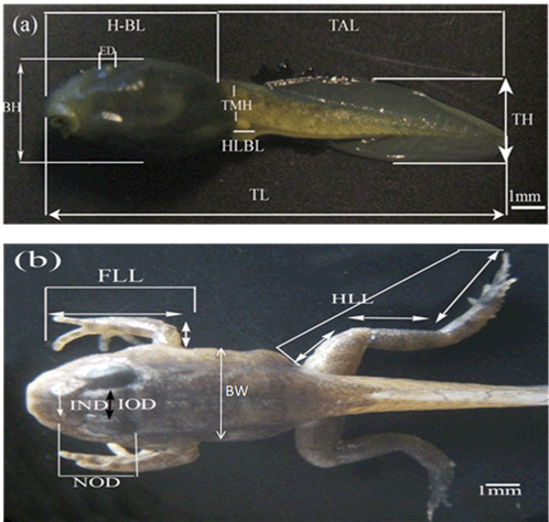 Specimen collection Experimental Setup Morphology and Morphometric measurements The external morphology of the different developmental stages were recorded including: Body Height (BH), Body Width (BW), Eye diameter (ED), Forelimb Length (FLL), Head- Body Length (H-BL), Hind Limb Length (HLL), Internarial Distance (IND), Interorbital Distance (IOD), Nostrial Diameter (ND), Distance between Narial and orbital (NOD), Tail Length (TAL), Tail Height (TH), Total length (TL), Tail Muscle Height (TMH) and Body Weight (BWE). The body parts were based on the proposals of [24] . The external morphometric measurements were described in (Figure 1a-b). Statistical analysis Ethical statement | ||||||