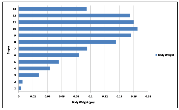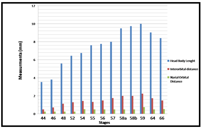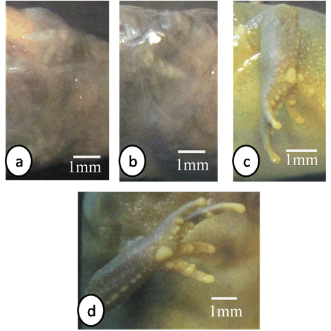 In the present study, developmental changes in external morphology characters and morphometric measurements were examined for the larval period of Bufo regularies. A developmental table consisting of 13 developmental stages from starting of feeding to complication of tail absorption every third day was recorded. To be useful, a staging table must be based on character states whose onset of development can be detected with minimal ambiguity, whose presence among individuals is stable, and, preferably, whose characteristics are quantifiable [6]. Gosner [10] suggested a generalized table of 46 stages covering the period from fertilization of the egg to completion of metamorphosis and this table has been used for the comparison of developmental stages of anurans world over. Sedra and Michael [20] had established a set of closely spaced developmental stages for the Egyptian toad Bufo regularies. These include stages numbered 1–66 which begin with the zygote stage and end with the newly metamorphosed individuals. We had used Sedra and Michael [20] staging table for identifying the stages of development of the studied tadpoles for its simplicity and general applicability. Morphology In the present study, we recorded that feeding of B. regularis tadpoles, began at stage 44. While in previous studies by Sedra and Michael [20] on the same spices noticed that at the beginning of this stage the tadpoles began route for start feeding. Gosner [10] considered the stage 25 start feeding in Bufo valliceps. In Scaphiopus bombifrons the feeding began at stage 24 [26] while in Scaphiopus intermontanus feeding began in either stage 24 or 25A [6], but in Microhyla ornate tadpole feeding began at stage 28 [27]. In Rana leptoglossa feeding began at stage 25 [4]. Hall and Larsen [6] declared that the larvae were able to begin feeding once their jaws had begun to keratinize. Sedra and Michael [20] recorded that the staging criteria associated with the development of the hind limbs which first noticeable in B. regularis during stage 46. These results were similar to the development of the hind limb bud in the Egyptian toad (B. regularis) tadpole in the present work. According to Gosner's table [10] in Bufo valliceps [10] [28] and in Rana pipiens [28] marked the initial presence of the hind limb bud as subsequent to the completion of opercullar development in stage 26. In contrast, in Rana sylvatica [29] , the bud is identifiable at the time when operculum begins development (stage 23), however, [6] noticed the first appearance of the hind limb bud in S. intermontanus during stage 24 (after opercular development had already progressed significantly but prior to completion). Similarly, Trowbridge [26] noted the first development of the hind limb bud during stage 23 in Scaphiopus bombifrons [6] described the first appearance of the hind limb bud in Scaphiopus intermontanus tadpole as an opaque swelling of tissue posterior to the abdomen and dorsal to the cloacal tailpiece. This description was in accordance with the present work. In our study in B. regularis foot paddle formation began at stage 52, when hind limb length reached one and a half times its diameter [10] had defined the foot paddle from the point when limb bud length reaches two times its diameter but formation of the foot paddle had not yet begun, and he recorded that the limb bud show as essentially bullet shaped prior to foot paddle formation (probably based on the description of stage 30 for Bufo valliceps by Limbaugh and Volpe [28], for Rana leptoglossa by Saha and Gupta [4], and for Microhyla ornata and Uperodon globulosus by Narzary and Bordoloi [18] confirmed the results of Gosner [10]. Also, they reported that stage 31 was the foot paddle shaped stage. [6] had been observed in S. intermontanus foot paddle formation began at about the point hind limb bud length was only slightly greater than its diameter. Our result was in agreement of [20] where they stated that, foot paddle formation in B. regularis occurs prior to the limb bud achieving a length of two times its diameter, but after it is one and a half times its diameter. In the present investigation, toe development in the hind limb of B. regularis tadpoles takes place from stage 52–56, where these stages takes degrees of toe development. Gosner and Taylor stated that a combination of degree of toe separation was recorded from stage 36–40 [10] [30] but, in Rana leptoglossa it had been observed that the toe differentiation occur during stages 31 to 39 [4]. In the present work, we observed first indentation between fifth and fourth toes in late stage 52. Whereas, the first indentation was noticed by Sedra and Michael [20] in stage 53 in the same species. The 2nd indentation was seen behind the fourth indentation which marks the third toe in stage 54, third indentation marks the 2nd toe at stage 55. The fourth indentation marks the 1st toe in stage 56. All five toes were visible and separated from each other. These results were similar to those described by Sedra and Micheal [20] in B. regularis. The same events were recorded by several authors [4] [18][27] in Microhyla ornata, Rana leptoglossa and Uperodon globulosus respectively, where they observed the margin of the foot paddle became slightly intended which marked the prominences of the fifth and fourth toes at stage 32, second indentation marks the 3rd toe in stage 33, third indentation marks the 2nd toe at stage 34 and the fourth indentation marks the 1st toe at stage 35. Landmarks between thigh, shank and foot with separation of all toes began at stage 56 and well differentiated at stage 57. At this stage well developed prehallux appeared as a small protuberance close to the base of the first toe. These results were similar to that described by Sedra and Micheal [20] at stages 56 and 57 in B. regularis. In our results in stage 57, we observed with the separation of all toes the fourth toe is the longest. Web clearly developed between