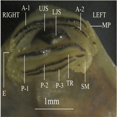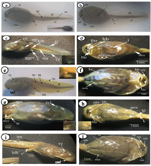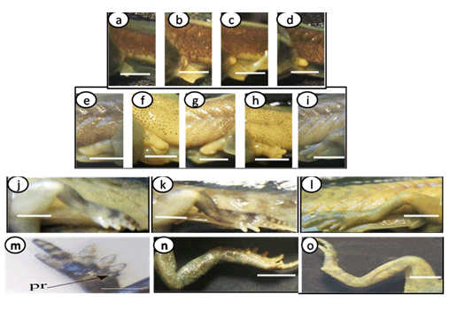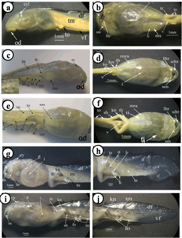 The important larval stages were differentiated on the basis of age, size and external morphological characters. Various stages of development and metamorphosis of Bufo regularies were divided into 13 stages. These were collected every three days from beginning of feeding to the end of the metamorphosis. This description was based on the normal table of [20] . The investigators described only the new structures appeared in each stage. Morphology Stage 44: Start feeding stage (TL; 7.5–7.5 mm, BWE; 0.003–0.005 g). At the beginning of feeding the body (head and abdomen) is oval in shape and pigmented dorsally, but ventrally there is no pigments. The dorsally located eyes are moderately large in size. The nares are oval in shape and positioned between the eyes and the oral disc. The protocercle tail is tapering and laterally compressed (Figure 2a-b). The pigmented tail musculature is poorly developed and gradually tapering from base to the sharp end. Unpigmented tail fin consisted of dorsal and ventral ones. They are slitghtly equal in size. The dorsal tail fin slightly smaller than the ventral one. Dorsal fin originates at body - tail junction and expanded slightly above the body. The lateral tubular vent is moderately large and directed posteriorly, entirely attached to ventral fin (Figure 2b). Coiling intestine appeared as triple U-shape ventrally. The mouth is located on the anteroventral side of the head. The small oral disc is transversally elliptical and consists of upper and lower lip. These lips carry teeth (Figure 2a&b). Stage 46: Appearance of the hind limb buds (TL; 8–10 mm, BWE; 0.0043–0.0068 g) In this stage, hind limb bud was visible for the first time as a faintly circumscribed projection in the groove between the base of the tail and body wall, (Figure 2c and 6a). Horny labial tooth rows of upper and lower oral disc were well developed. The first indication of two narrow longitudinal strands of muscle fibers of the M. rectus abdominis were observed through the transparent skin of the abdomen. Intestine is more coiling. Melanophores began progressively spread ventrally. Segmentally arranged myotomes are noticed for the tail muscles (Figure 2c-d). Stage 48: Length of hind limb bud was equal to one and half times of its diameter (TL 12.5–13 mm; BWE; 0.024–0.036 g) Length of hind limb bud was equal to one and half times of its diameter (Figure 2e and 6c). Horny teeth and sub marginal papillae very highly developed. Through the transparent skin the elongation of the two narrow longitudinal strands of muscle fibers of the M. rectus abdominis was observed (Figure 2f) . The Spiral coiling of the intestine increased, central coil of intestine still lies on the same level as that of the surrounds. Eye lens was very distinct. Spreading of blood capillaries in the dorsal fin was seen (Figure 2e-f). Ventral view of the tadpole showing a typical oral disk apparatus at this stage which consists of upper and lower labia, enclosing upper and lower serrated jaw sheath (horny beak). The lower serrated jaw sheath of the horny beak appeared as V shape and the upper one was crescent in shape. The upper and lower labial ridges had horny teeth. There are two rows of horny teeth in the upper lip; the anterior one is complete, while the posterior one is discontinuous medially. The lower lip has three continuous rows of horny teeth. The number and configuration of tooth rows was indicated by a labial tooth row formula (LTRF) that is 1: (1+1)/3 according to Sedra and Michael (1961). The labia were framed by lateral rows of marginal and sub marginal papillae (Figure 3). Stage 52: Foot paddle stage (TL; 15.3–17.4 mm; BWE; 0.041–0.046 g) Landmarks between parts of the hind limb were slightly distinguished. Distal end of hind limb buds were moderately flattened to form the foot paddle and slightly bent ventrally (Figures 2g and 6e). No interdigital indentation was noticed at the paddle margin. At the end of this stage first interdigital indentation were noticed. The fifth and fourth toe prominences were separated by a slight indentation at the margin of the foot paddle. Through the thin transparent skin well developed M. rectus abdominis and tail muscles were seen. Extremely distinctive segmentally arranged myotomes were noticed of the tail muscle. Each myotome is completely enclosed in a sheet of fibrous connective tissue (myocomma). The myotomes are >-shaped, each having an upper and lower limbs; their enclosing myocomma was also of the same shape and well visible externally (Figure 2g-h). Stage 54: Second indentation (TL; 17.9–19.2 mm, BWE; 0.054–0.05 g) The hind limbs were well-differentiated into thigh, shaft and foot. Second indentation occurred on the ventral side behind the prominence of 4th toe, which marks the 3rd toe (Figure 2i and 6g). Muscle fibers of M. rectus abdominis were more distinct forming an elongated sheet on either side of the middle line; this muscle is broad posteriorly and thinner anteriorly. Tendinous intersections were clearly observed (Figure 2j). Highly developed sub marginal papillae of the oral disc were noticed. Central coil of intestine pushed its way inward, (Figure 2i-j). Stage 55: Third indentation (TL 17–18.3 mm, BWE; 0.081–0.087 g) The margin of foot paddle became indented on ventral side, behind the prominence of 3rd toe which marks the prominence of 2nd toe. Pigments of melanophores were noticed on the thigh and shank of the hind limbs (Figures 4a and 6h). Tail musculature was strong, gradually tapering, almost reaching tail tip. Tail fins were moderately high, not extending above the body (Figure 4a-b). Stage 56: Fourth indentation (TL; 21.5–22 mm, BWE; 0.094–0.097 g) Hind limbs were highly differentiated into thigh, shank and foot, pigmentation is spreading on the upper surface of the shank as well as on the toe prominences (Figure 4c and 6i). The margin of foot paddle was indented behind the second toe demarcating the prominence of th