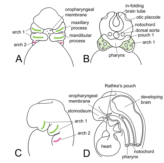 Figure 1: Internal and external view of the developing head and neck at week 4. (A) Ventral view depicting the early heart, maxillary and mandibular processes of arch 1, arch 2, and the oropharyngeal membrane with several perforations. (B) Cross sectional view showing the relationship between the folding neural groove, pharyngeal arch contents, and notochord. The otic placode is depicted before penetrating the head to form the otic vesicle. The pharyngeal arch contains an associated artery, vein, nerve, muscle, and cartilage, all of which are capped by an intramembranous ossification. The dorsal aorta is initially a bilateral structure with the notochord positioned at the midline; the aortae fuse to form a single vessel during week 4. (C) Lateral view representing the developing heart, head, and neck. Arch 1 has a dorsal and ventral component, separated by the temporal-mandibular hinge joint (TMJ). (D) Internal view emphasizing the interrelationship between the pharyngeal arches and arterial branches, as well as the notochord and developing brain.