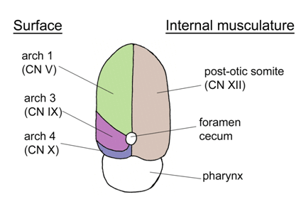 Figure 10: Tongue development and innervation the surface of the tongue is formed by contributions from pharyngeal arches 1, 3, and 4, with surface projections of arch 2 being overgrown by the other arches. The general and special sensory distribution is indicated to the left, and the motor innervation is shown on the right.