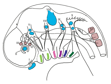 Figure 3: A generalized embryo demonstrating the three functional types of cranial nerves. Cranial nerves I, II, and VIII are associated with the olfactory, lens, and otic placodes respectively. Cranial nerves III, IV, and VI are associated with the pre-otic somites, and cranial nerves XI and XII are associated with the post-otic somites. Cranial nerves V, VII, IX, and X are associated with the pharyngeal arches, and have mixed motor, sensory, and secretory functions. Placodes are shown in light blue, and somites are shown in light red. Each pharyngeal arch is labeled in a different color (1- light green, 2- pink, 3- purple, 4- dark blue, 6- dark green).