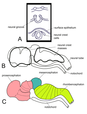 Figure 4: Neural crest cell formation and the early brain. (A) Progressive infolding of the neural groove, with the detachment of the neural crest cells, which will migrate ventrolaterally, (B) Neural crest masses descending from the developing brain. The notochord is positioned below the neural tube, (C) Division of the early brain into segments, including the prosomeres of the prosencephalon and the rhombomeres of the rhombencephalon.