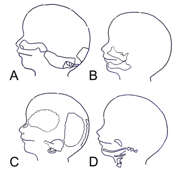 Figure 6: The four types of bones forming the skull. (A) Neurocranium, which is formed from endochondral ossifications. The area around the foramen magnum is formed from parachordal somites, which are adjacent to the notochord, (B) The splanchnocranium, which are intramembranous bones that cover pharyngeal cartilages, (C) The intramembranous dermal skull bones, and (D) The bones and cartilages associated with the pharyngeal arches.