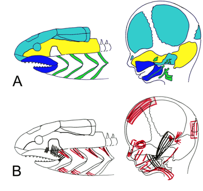Figure 7: Comparative anatomy of the skull bones and facial musculature. (A) Skull components in the primitive fish (crossopterygian) and human head. Neurocranium is shown in yellow, splanchnocranium in dark blue, dermal bones in light blue and pharyngeal arch cartilages in green. The gill cartilages in the fish are homologous to the pharyngeal arch derivatives in the human, including the ear bones, alisphenoid, and hyoid, (B) Pharyngeal arch musculature of crossopterygian fish and human. The human facial muscles are homologous to the muscles moving the gills in the fish. During evolution, the pharyngeal arch muscle fibers migrate from their original position on the gills, to the facial surface, but retain their original innervation.