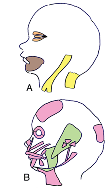 Figure 8: The muscles of the head. (A) The facial and certain neck muscles derived from preotic (orange) and postotic somites (brown and yellow). The first preotic somite creates the inferior oblique, superior rectus, inferior rectus, and medial rectus muscles. The second preotic somite creates the superior oblique muscle. The third preotic somite develops into the lateral rectus muscle. The first four postotic somites develop into the intrinsic muscles of the tongue, and the postotic somites 5–7 create the sternocleidomastoid and trapezius muscles. (B) The facial muscles associated with pharyngeal arches 1 (green) and 2 (pink).