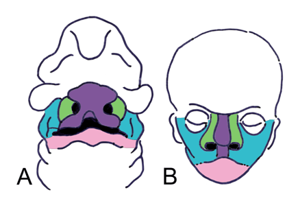 Figure 9: The development of the facial surface. (A) Facial development around week 7, showing the medial nasal processes fusing at the midline to form the intermaxillary process (purple), the lateral nasal processes (green), the maxillary processes laterally (blue), and the mandibular process (pink). (B) Facial development around week 10, demonstrating the intermaxillary process condensing to form the median surface of the nose and philtrum (purple), the lateral nasal processes forming the alar cartilages of the nostril (green), the maxillary prominence expanding to form the majority of the maxillary surface (blue), and the mandibular prominence forming the surface of the chin and jaw (pink). Note: the colors do not correspond with the pharyngeal arches, or structures depicted in other figures.