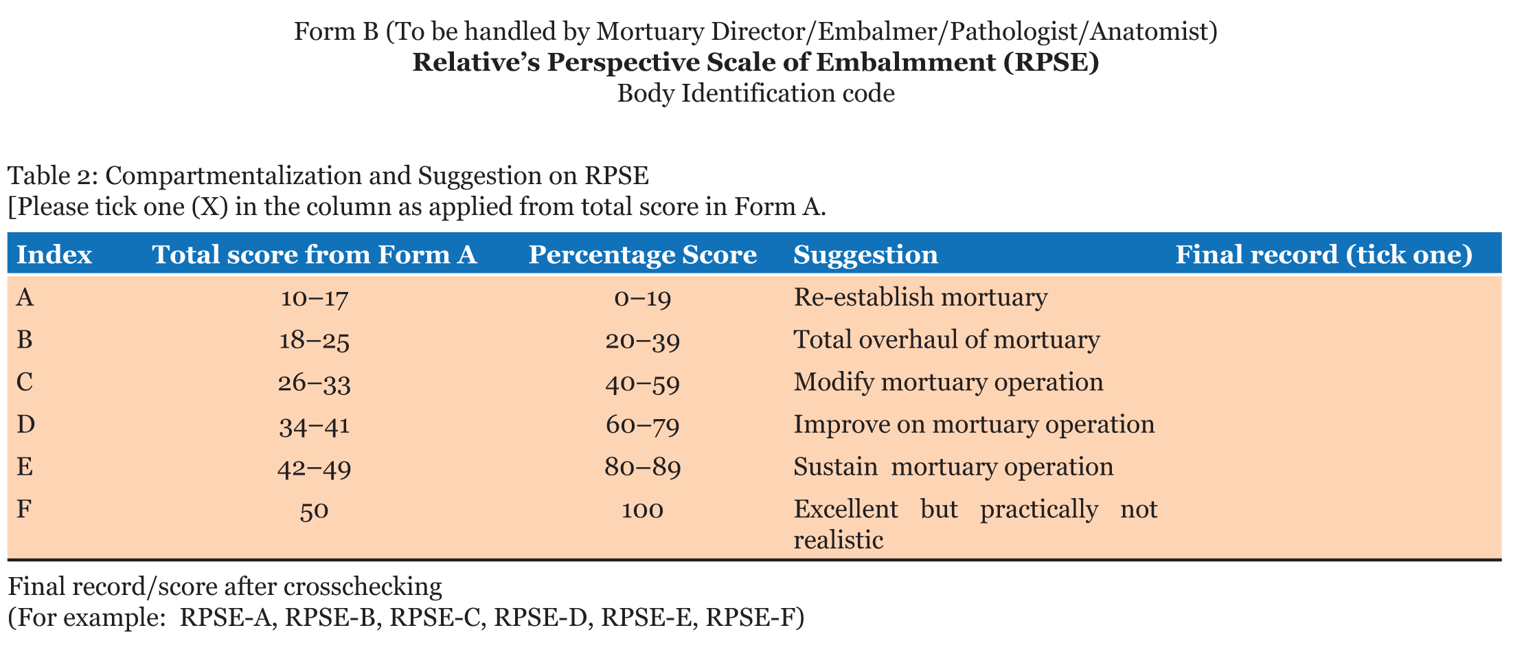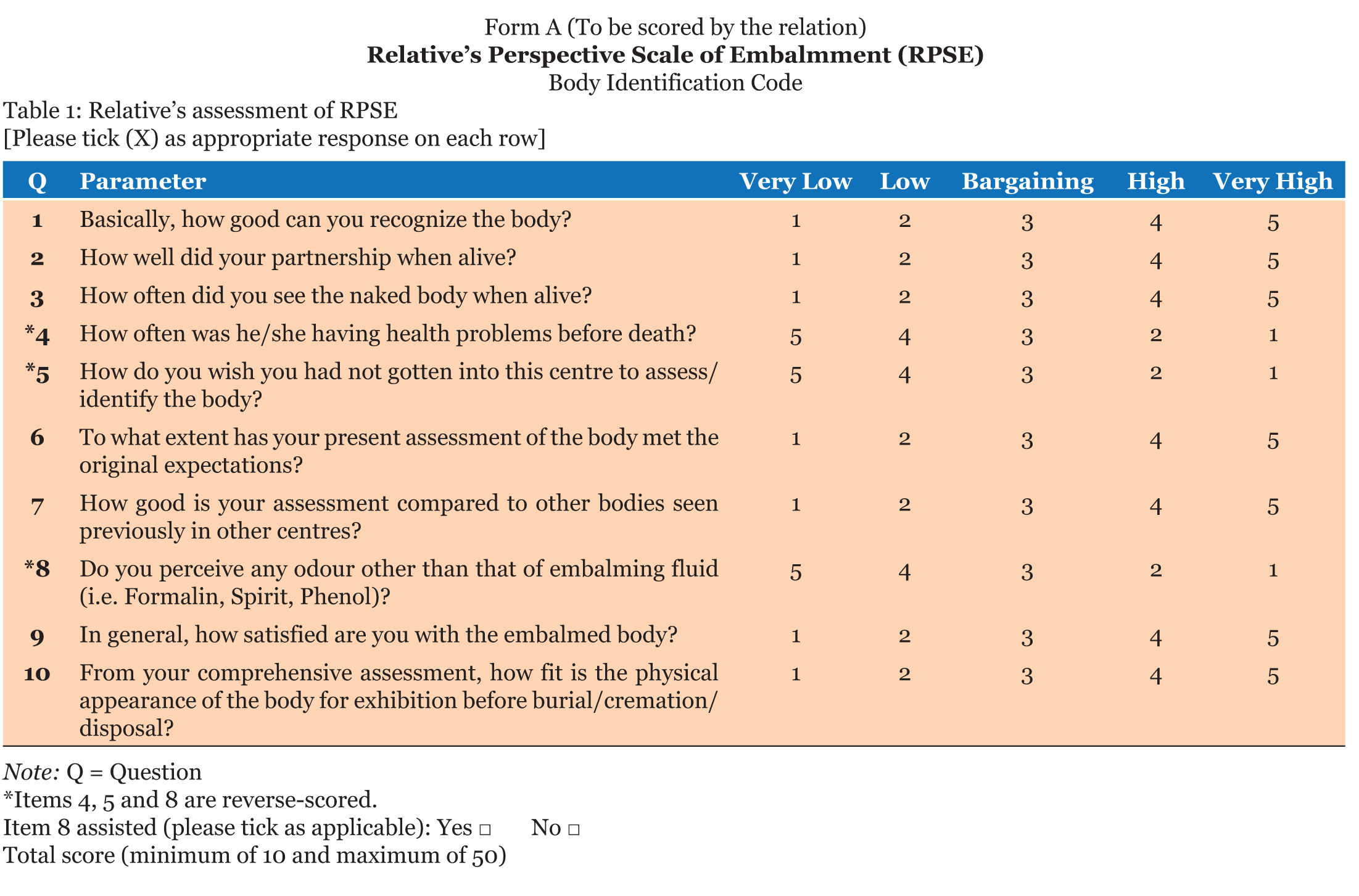 Relative's Perspective Scale of Embalmment is an innovative scoring tool born out of curiosity to address the limitations in preservation of tissue and embalming of human remains in an attempt to better anatomic sciences. Objectives: Specifically, emphasis is on acceptability and satisfaction of embalmed body by the relatives, suitability of mortuary for cadaver acquisition in research and training, and validation of the scoring tool by different mortuary institutions across the globe.