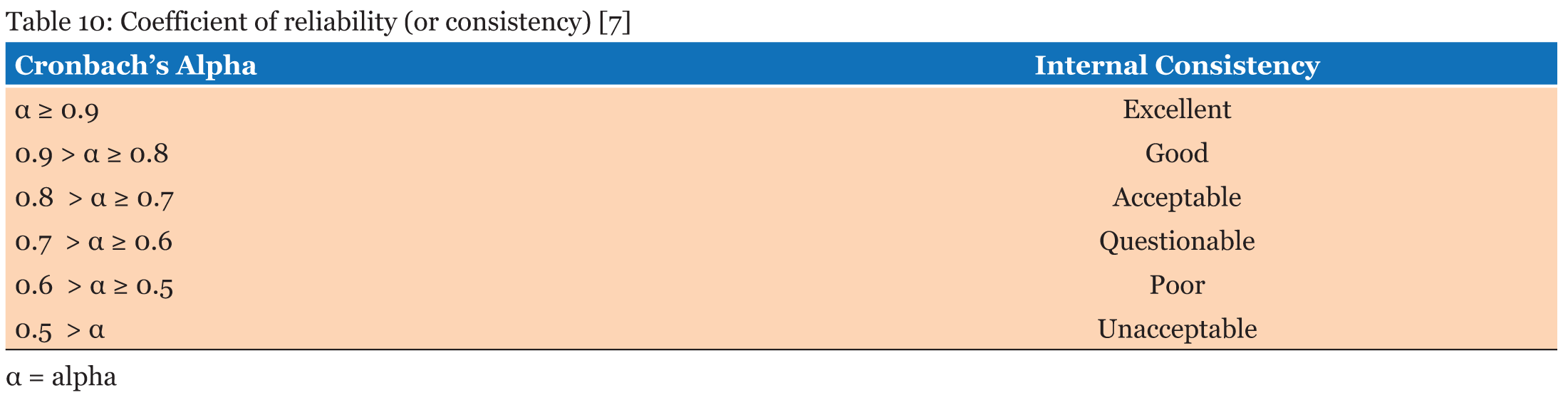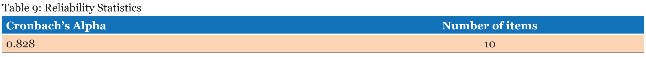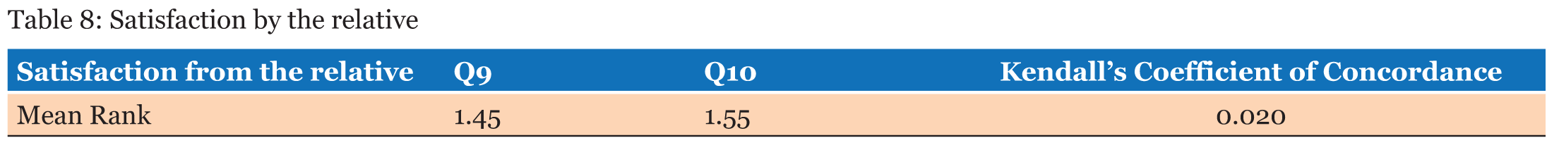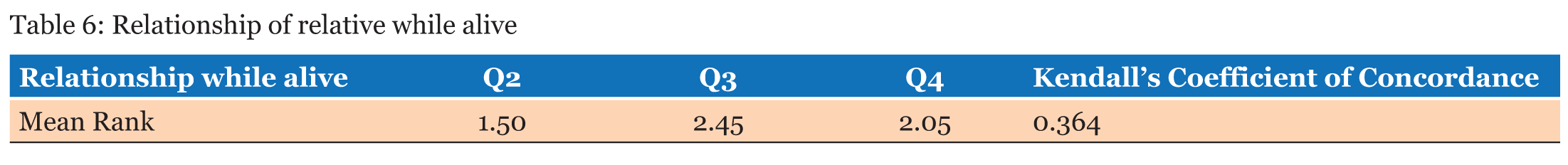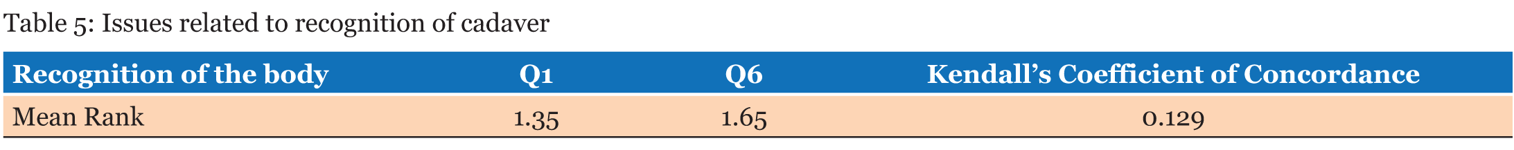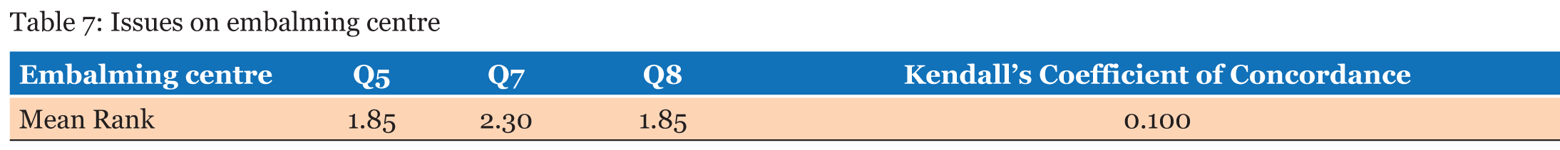 Tables 4 to 9 are on matters related to pilot study earlier conducted to ascertain the feasibility of the study. Table 4 shows the evaluation of ten embalmed bodies from the scores by the relatives. The core items are represented in words rather than numerals for coherency and understanding. Percentages of individual score calculated with assumption for a period and judgment implemented. In Table 5 , using Kendall's Coefficient of Concordance, p-value was statistically-insignificant. Therefore, null hypothesis was accepted at 95% Confident Interval (CI) proving that there was no significant difference on matters related to recognition by the relatives. In Table 6 , p-value assessing relationship of the relatives with the dead ones when alive equally confirmed no significance in the statistics. Null hypothesis was then accepted to show the similarities among the items. In Table 7 , p-value was greater than 0.05, hence statistically-insignificant and null hypothesis accepted: there were no differences on the assertions on embalmed centres. In Table 8 , null hypothesis was rejected because p-value was statistically-significant. It then means that the questions on the degree of satisfaction from the relatives were independent. Table 9 qualitatively shows the Cronbach's alpha value 0.828 corresponding to internal consistency of 'Good' ( Table 10 ) . Reliably speaking, this study is readily assessable as a scoring tool. |