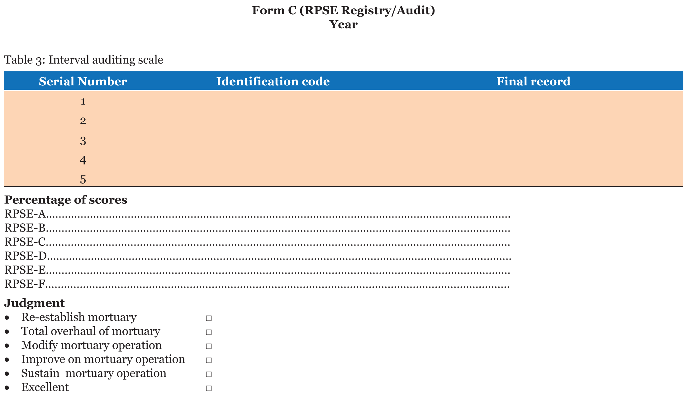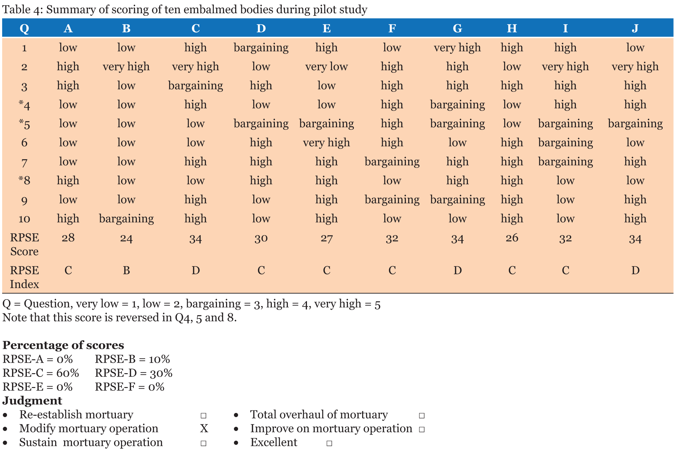 Approval was granted from the appropriate ethical committee of the institution before commencing the main study after the pilot/trial at the Mortuary Complex, Department of Anatomy, Ekiti State University, Ado-Ekiti, Nigeria. The duration of the study was 5 months. The scoring tool was developed solely from a 7-item scale designed to measure general relationship satisfaction [6]. Modification and addition were carried out with resultant 10-item scale. There are three forms with same identification code for A and B: Form A is to be handled by any of the close relatives of the dead, next-of-kin or family physician while Form B will be justified by the mortuary director, embalmer, pathologist or anatomist as the case may be after crosschecking the relative's assessment Form A. Form C is to be kept as RPSE Registry/Audit by the institution. Table 1 in Form A contains 10 questions. Any assistance on item 8 (in case of smelling disorder), a staff shall be informed and be documented as: Yes or No. It should be noted that items 4, 5 and 8 are reverse-scored; and scoring is kept continuous with minimum of 10 and maximum of 50. Table 2 was designed for categorization of numbers in Table 1 along with useful suggestions. Percentage score added to simplify quantitative statistical comparison amongst different centres. Final assessment was recorded as RPSE-A; the worst to RPSE-F; the best. The assessment proper comprising the two forms was made to occupy two pages as the meat of the whole exercise. This could as well be compressed into a single page/sheet. Table 3 is contained in Form C for yearly or interval pooling of all forms for auditing of action by the institution. A serial number is appended on each Form B while entering data into Table 3. The overall percentage for each assessment is collated for interval judgment on the state of the mortuary. Sample size of pilot study was 10. Data from the pilot study was collated and entered into Statistical Package for Social Sciences (SPSS version 21) for analysis calculating: means, frequency, Kendall's Coefficient of Concordance (KCC) with 95% Confidence Interval (CI) and Cronbach's alpha for test of reliability [7]. P-value of less than 0.05 was taken as index of significance. | ||||||