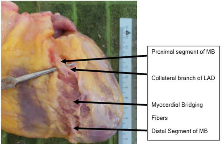 In this cross-sectional analytic study, 45 hearts with myocardial bridging, males 30 (67%) and females 15 (33%), the age ranged from 24 to 85 years (mean 52 years), were collected from North Okkalapa General and Teaching Hospital during December 2017 to December 2019. Ethical approval for this study was obtained from the Institutional Review Board of Defence Services Medical Academy and Defence Services Medical Research Center (FWA-00023030, IORG-0009413, IRB-00011205). The length and thickness of MB were measured with the aid of Vernier Callipers, with 0.01 mm precision. Then, the four pieces of the coronary artery were taken in proximal (segment 1), under (segment 2) and distal segments (segment 3) of the coronary artery with MB, and segment from a coronary artery without MB in the same autopsy hearts to be used as control (segment 4).