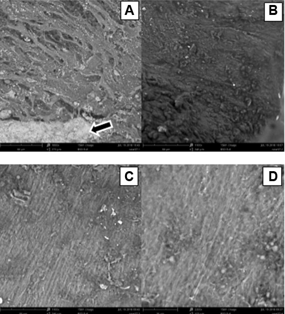 Scanning electron microscopic findings of endothelium at proximal, under, distal, and control segments