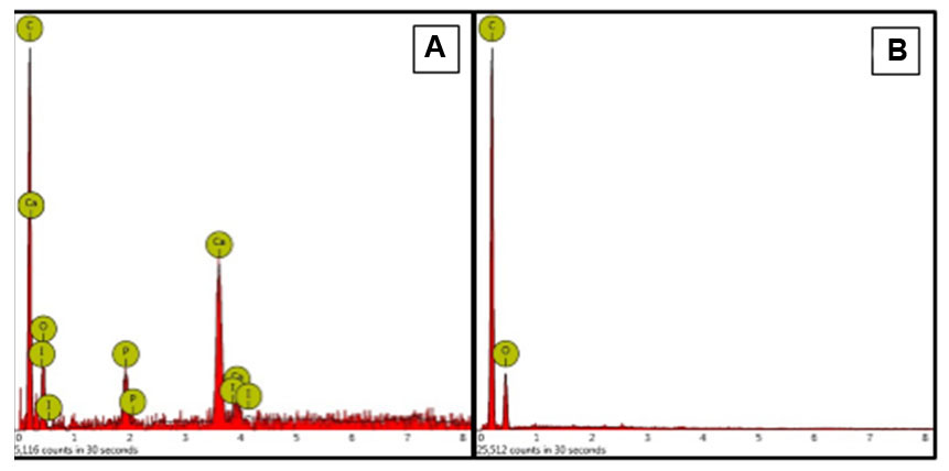 In the energy dispersion X-ray spectrometry analysis, the Calcium element was found six cases in the proximal segment (segment 1), one case in segments 2 and 3, and three cases in segment 4, respectively. Iron (Fe) was detected in four cases in segment 1 and one in segment 2. The other elements such as sodium (Na), phosphorus (P), copper (Cu), and sulfur (S) were detected. In energy dispersion X-ray spectrometry analysis of case number 37, energy dispersion X-ray spectrometry (EDS) spikes showed carbon (C), calcium (Ca), oxygen (O), nitrogen (N), and phosphorus (P). The energy dispersion X-ray spectrometry for calcium (Ca) was 1.27% atomic concentration (3.66% weight concentration) and phosphorus (P) was 0.84% atomic concentration (1.88 % weight concentration) (Figure 3).