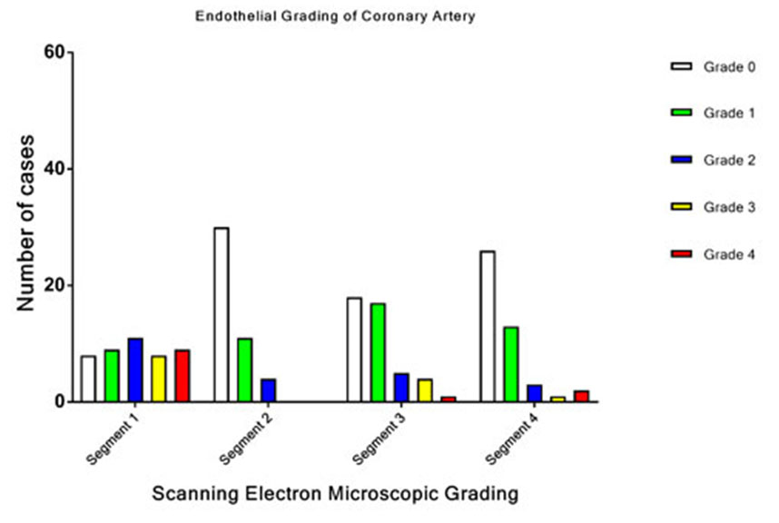 In the endothelium of under bridging segment (segment 2), the range of endothelial grading score was “0–2.” The mean and sum of endothelial grading scores were 0.42 and 19, respectively. In the endothelium of the distal segment, the mean and sum of endothelial grading scores were 0.96 and 43, respectively. In the endothelium of the control segment (segment 4), the range of endothelial grading score was “0–4.” The mean and the sum of endothelial grading score was 0.67 and 30, respectively.