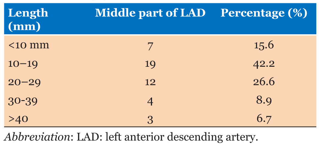In the present study, 45 bridges (18.5%) were observed among the 243 autopsy hearts. There were located on the LAD in all cases (100%). Myocardial bridge was observed in males 30 (67%) and females 15 (33%), the age ranged from 24 to 85 years (mean 52 years). There were no double MBs in LAD. All MBs were located in the middle part of the LAD (Figure 1). The presence of a collateral branch was found in the LAD of three autopsied hearts. The collateral branch arose before the LAD entered to the myocardial bridging segment. The mean length of the MB was 18.3 ± 11.7 mm (range 1.5–59 mm). The mean thickness of the MB was 2.8 ±1.5 mm (range 1–6.3 mm). The length of the MB is described in detail in Table 1.